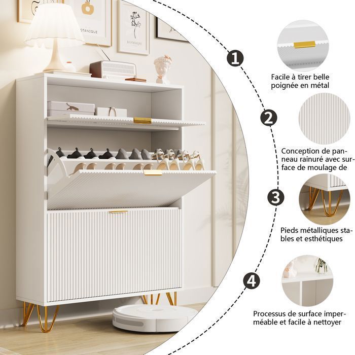 Meuble Chaussure Blanc Armoire à Chaussure Blanc Brillant 102x36x60 Cm Bois Ingénierie Meuble Chaussures Shane Armoire à chaussures, 3 casiers, 2R, blanc Armoire à chaussures moderne 83 x 178 x 24 cm. Demeyere Meuble à Chaussures 2 Abattants et 1 Tiroir - Panneaux de Particules- Style Contemporary - Pour Entrée- L80.8 x D24.4 x H101.8 cm · White. 129,00 €129... Jusqu'à environ 12 paires de chaussures. 5 niches et 18 barres. Couleur : blanc. Garantie 2 ans Démonté. Vous apprécierez la commodité de cette solution de rangement pour garder vos chaussures <strongbien organisées et accessibles</strong. Cette armoire à chaussures combine style et fonctionnalité pour <strongrépondre à tous vos besoins de stockage de chaussures</strong. La poignée en métal ajoute une touche moderne à l'ensemble, tandis que les tubes métalliques de 10 mm assurent la solidité de la structure. Demeyere - Rangement Et Organisation 2 portes avec 1 porte miroir.