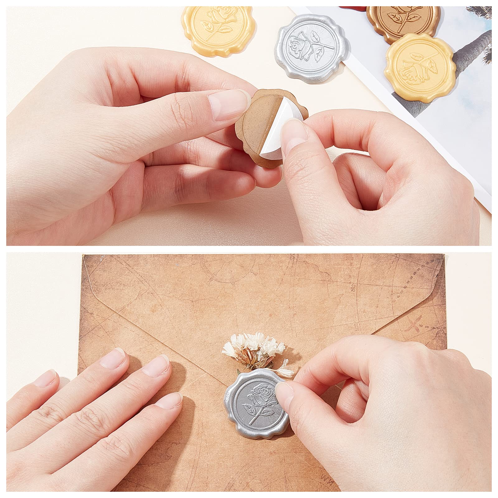 invitations, Cartes de voeux, sacs-cadeaux, albums de coupures, revues d'art. Bâton de cire bronze de grande qualité - Cire - La Paqueterie Applications larges : ces autocollants de tampon de cire peuvent être largement utilisés comme décoration de nombreux projets, comme les cartes d'invitation de mariage, Plans, bouteille, enveloppes, colis, scrapbook, album photo, cadeaux, étanchéité du vin, emballage de thé ou de cosmétiques. Autocollants de sceau de cire auto-adhésifs : les autocollants d'enveloppe de scellage sont fabriqués à partir de véritable cire à cacheter avec un support auto-adhésif solide, il suffit de décoller le support et de coller les autocollants partout, gagner du temps et facile à utiliser. Taille : les autocollants pour sceau de cire mesurent environ 1.18 cm de diamètre. 400 Pièces Autocollants De Sceau De Cire Florale En Feuille Rétro, Autocollant En Forme De Cœur Miss you -Tampon de cire Vintage Rose amour cœur, sceau de scellage... Craspire 100pcs autocollants de sceau de cire adhésive, décoration de sceau d'enveloppe, pour le cadeau de bricolage de scrapbooking d'artisanat, verge d'or, fleur, 30mm (DIY-CP0009-47B boîte en plastique d'environ 3.15 x 5.87 x 0.9 pouce, la taille des autocollants pour sceau de cire convient pour être utilisée comme décor idéal, tous les autocollants pour sceaux de cire sont dans une boîte, gardez-le organisateur, la boîte est réutilisable. la couleur avec des paillettes, élégant et vintage.