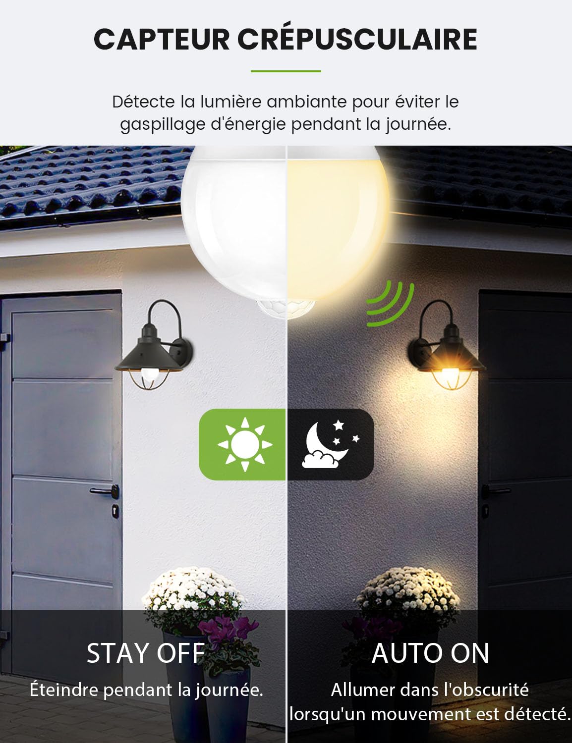 Ampoule LED E27 détecteur de mouvement et de luminosité - 32W Cette ampoule s'allume intelligemment dans la plage de détection uniquement la nuit ou dans des conditions sombres, ce qui permet d'économiser énormément d'énergie. Ampoule Detecteur de Mouvement - nos ampoules de capteur de mouvement sont quip es d'un capteur infrarouge PIR r actif. Cette ampoule E27 brille avec une luminosité de 2700k et 1100lm, ce qui la rend idéale pour une utilisation intérieure et extérieure Lampe Led Detecteur Mouvement Torkase Ampoule Detecteur De Mouvement, Ampoule E27 LED 13W 1100LM Blanc Chaud 2700K Avec Capteur De Mouvement, Auto On/Off Ampoule LED Pour Escalier Jardin Balcon Garage, Lot De 3 Alexa Enceinte Connectée Il détecte également les mouvements des animaux et peut éclairer votre animal de compagnie même si vous êtes absent de la maison ou endormi la nuit. Profitez d'un éclairage relaxant Assurez - vous que la tête de l'ampoule doit être orientée vers la zone d'induction à une distance et un angle appropriés. 【Économie d'énergie de Haute Qualité】- - ampoule à haute efficacité à détection de mouvement, économie d'énergie jusqu'à 85%. 【Ampoule à Détection】Ampoule LED E27 est équipée d'un capteur de mouvement sensible qui s'allume automatiquement lorsque des objets en mouvement sont détectés dans une plage de détection de 7 mètres autour de l'ampoule Profitez d'un clairage relaxant, conomie d' nergie de haute qualit - - ampoule haute efficacit d tection de mouvement, conomie d' nergie jusqu' 85%. Profitez de la commodité de l'éclairage mains libres à tout moment, n'importe où. Attention aux détails du produit Il fonctionne ac100-240v avec une puissance de 13W, ce qui quivaut une ampoule traditionnelle de 100 watts. 【Le Meilleur Choix d'éclairage】- nos ampoules de capteur de mouvement sont idéales pour toutes sortes d'occasions familiales, polyvalentes et peuvent être utilisées dans les escaliers, les couloirs, les salles de bains, les portes d'entrée, les salles de stockage, les garages, les placards, les balcons, les portes, etc. Étonnamment, il s'éteint pendant la journée, même en cas de mouvement, empêchant les manipulations inutiles dans des conditions lumineuses Les fans préférés des utilisateurs commençant par Torkase Philips Ampoule E27- 13W LED Classique Dépolie Blanc Chaud, E27 120W Elle est conçue pour résister à l'épreuve du temps et a une durée de vie de plus de 20 000 heures La distance entre les deux ampoules doit être maintenue à au moins 10 pieds pour éviter les interférences mutuelles. 【Capteur du Crépuscule à l'aube】- capteur photoélectrique intégré, l'ampoule du détecteur de mouvement s'allume automatiquement dans l'obscurité lorsqu'un mouvement est détecté.