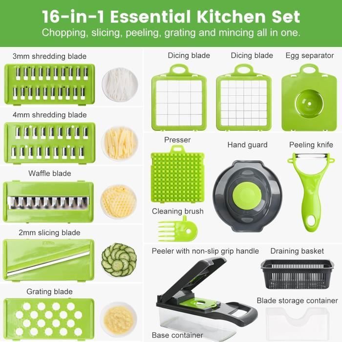 Accessoires inclus : livré avec plusieurs lames pour trancher, couper en dés, hacher et julienner, ainsi que des séparateurs d'œufs, des trancheuses d'œufs et des outils de nettoyage. Hachoir à légumes tout-en-un : ce gadget de cuisine polyvalent vous permet de trancher, couper en dés, hacher et julienne des légumes, des fruits, et plus encore sans effort avec des lames interchangeables. Rangement compact : le design imbriqué du hachoir permet à tous les composants de s'adapter parfaitement à l'intérieur du récipient pour un rangement facile et peu encombrant. Hachez, tranchez et coupez en dés sans effort pour obtenir de délicieux repas avec ce hachoir à légumes polyvalent. Mandoline Cuisine ALLIGATOR 3002 - Hachoir Multifonction 3 En 1 - Coupe Légumes - Coupe Decoupe Legumes Coupe-légumes 15 en 1 Cet ensemble de hachoir à légumes comprend 7 lames, 1 séparateur d'œufs, 1 fourchette, 1 panier de vidange, 1 curseur, 1 couvercle, 1 récipient alimentaire et 1 compartiment à lames Design efficace : le grand récipient à 4 tasses avec base antidérapante peut contenir les ingrédients hachés, tandis que le couvercle rotatif avec plusieurs lames coupe les aliments à la taille et à la forme souhaitées. Le hachoir à légumes en acier inoxydable trempé est facile à hacher ou trancher les légumes et les fruits en un seul mouvement facile à chaque fois. Les lames sont aiguisées, selon la dureté des légumes ou des fruits pour utiliser différentes forces pour couper Rosenstein & Söhne mélangeur manuel: Hachoir et coupe-légumes manuel, cordon de traction, 5 lames, 900 ml (hacheur à main Avec plusieurs lames interchangeables, ce hachoir peut gérer tout, de trancher les oignons aux carottes en dés, ce qui rend la préparation des repas un jeu d'enfant. La construction robuste assure une performance fiable, tandis que le récipient transparent vous permet de garder un œil sur vos progrès.